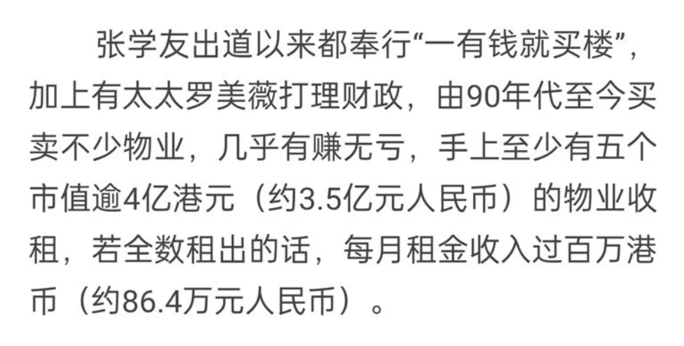 不得不说,老张活得是真通透,而这份通透也体现在他的资产状况上,比如他名下至少价值16亿元的南区不动产、浅水湾豪宅的升值轨迹,都侧面印证了欠巨债谣言是多么离谱。