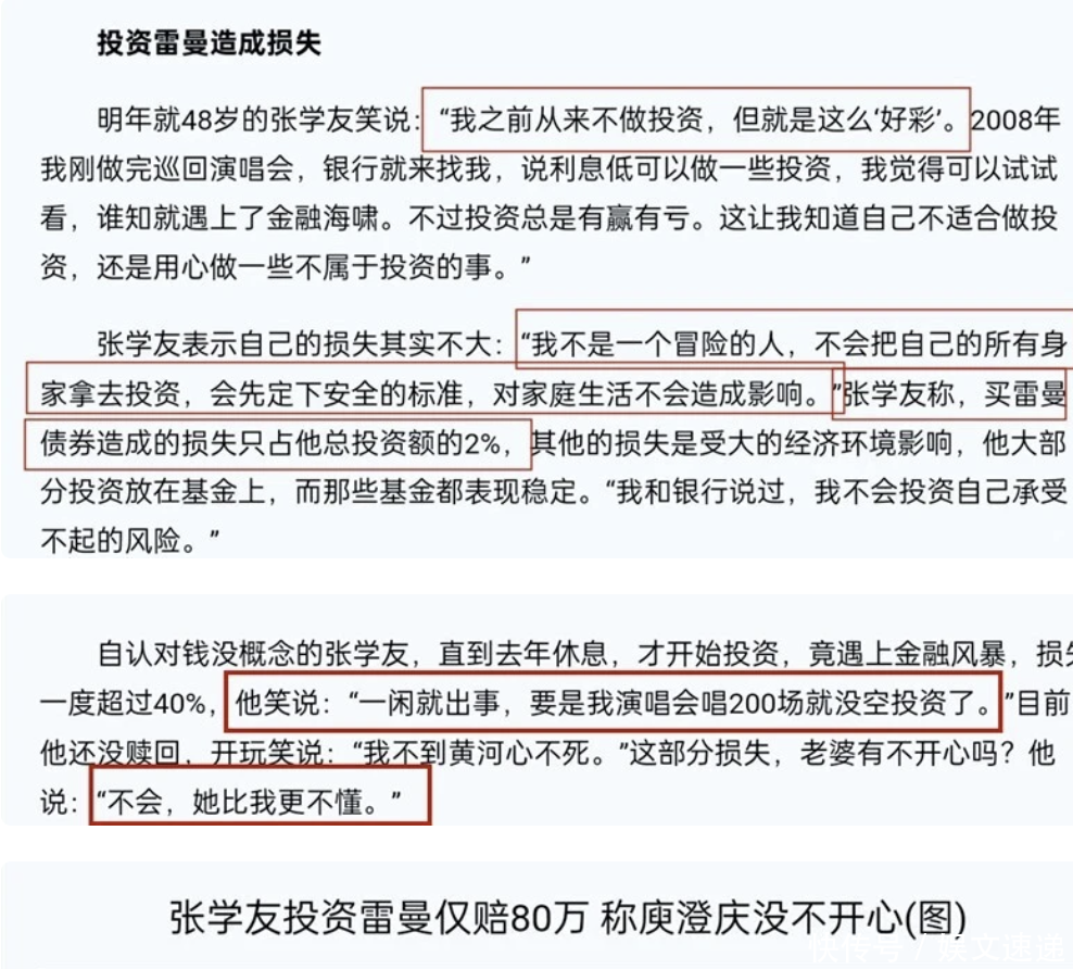 结果不幸登错船赔进去约4千万港币,后被有心人借着“常驻综艺、连开演唱会等专赚快钱的艺人就是有经济危机”的臆想,添油加醋给老张造了个谣。
