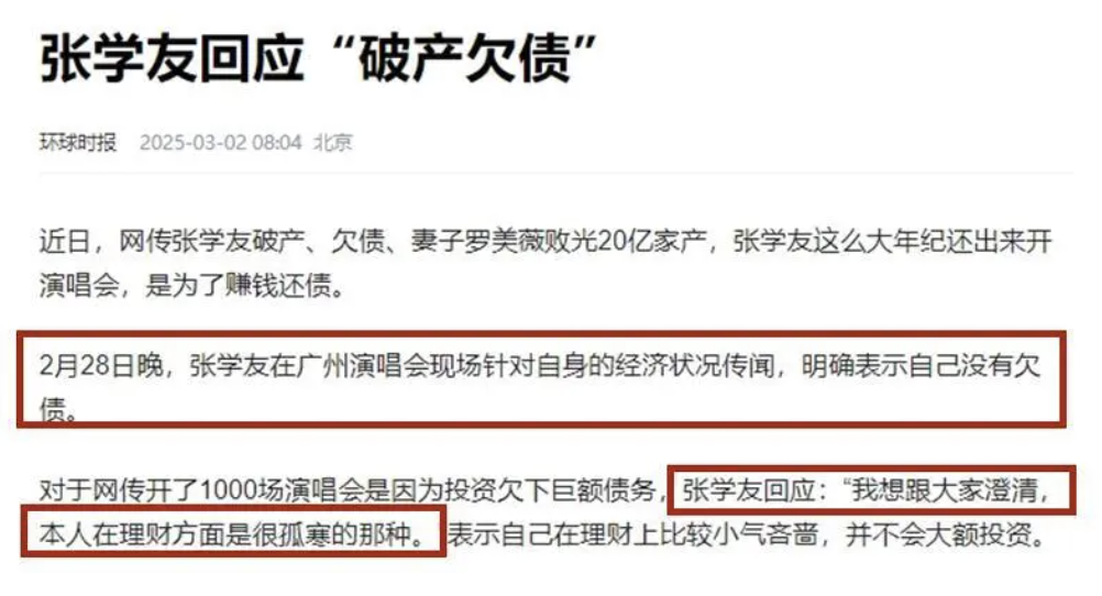 忙着巡演的张学友分身乏术,只能等机会一并回复,比如公开辟谣称:我生活很节俭且有存钱习惯,没有借钱必要!造谣的,别来沾边!